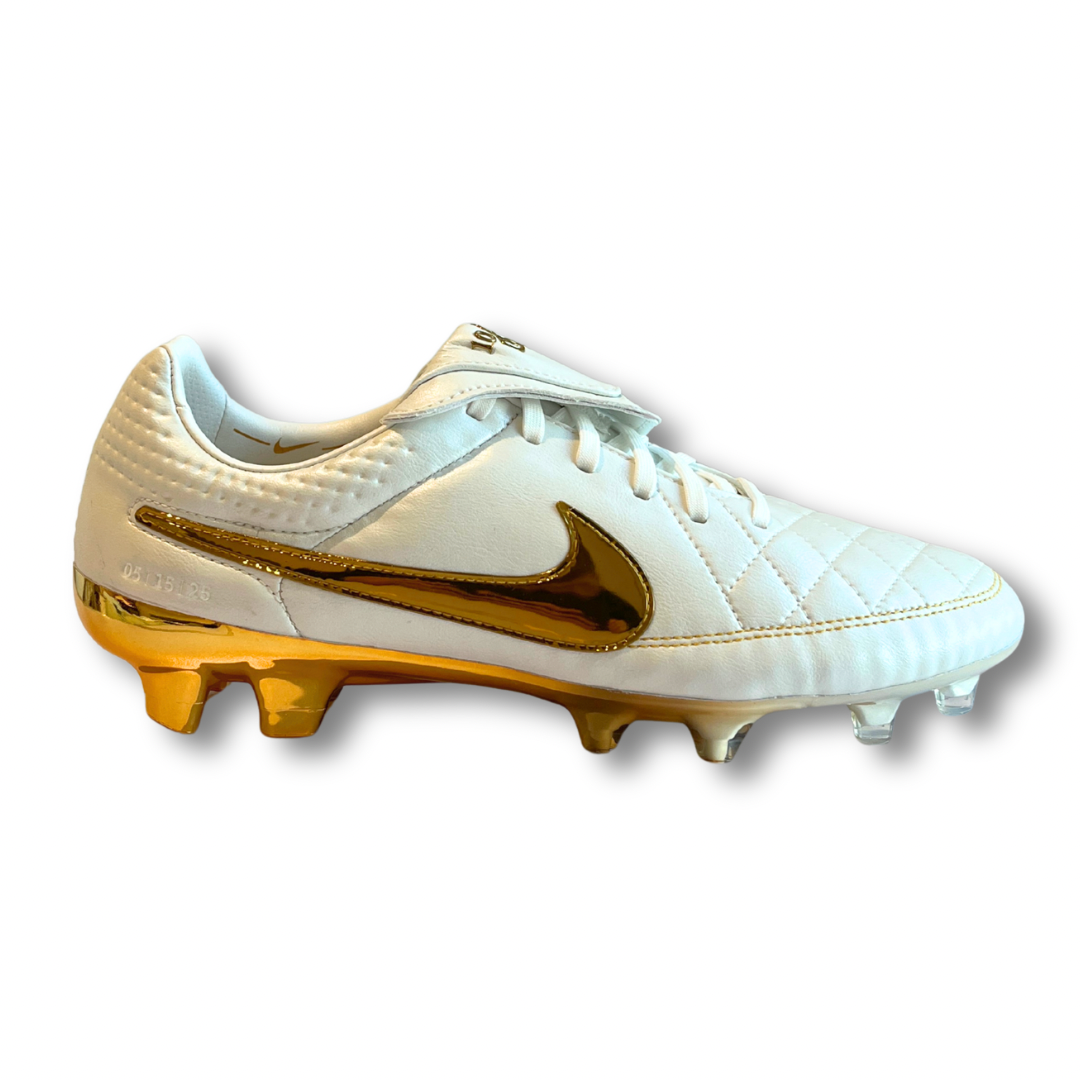The Nike R10 Tiempo Legend “Touch of Gold” is a modern remake of one of football’s most iconic boots, originally worn by Ronaldinho during his peak years. This edition draws directly from the 2005 Tiempo R10, as well as the Tiempo V remake in 2015, featuring a premium white leather quilted upper, fold-over tongue, gold detailing. It combines the look and feel of the original with updated comfort and performance, making it a standout release for both collectors and players.